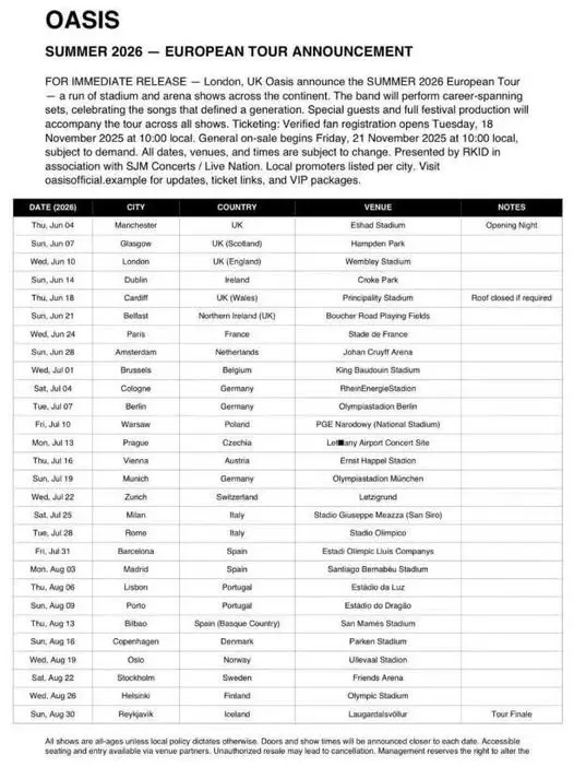 La imagen parece formar parte de un dossier oficial de promoción, con el título “Oasis – Summer 2026 European Tour Announcement”, y detalla no solo las fechas sino también los recintos y observaciones logísticas de cada ciudad. Por ejemplo, se especifica que el show en Cardiff se celebrará con techo cerrado en caso de mal tiempo.